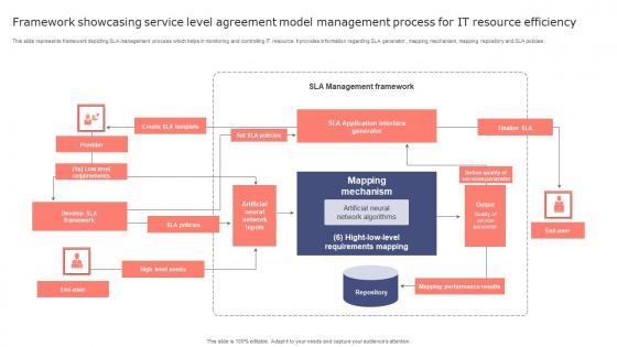 This slide represents framework depicting SLA management process which helps in monitoring and controlling IT resource. It provides information regarding SLA generator , mapping mechanism, mapping repository and SLA policies. Pitch your topic with ease and precision using this Framework Showcasing Service Level Agreement Model Management Process For It Resource Efficiency Rules Pdf. This layout presents information on Provider, Policies, High Level Needs. It is also available for immediate download and adjustment. So, changes can be made in the color, design, graphics or any other component to create a unique layout. This slide represents framework depicting SLA management process which helps in monitoring and controlling IT resource. It provides information regarding SLA generator , mapping mechanism, mapping repository and SLA policies.