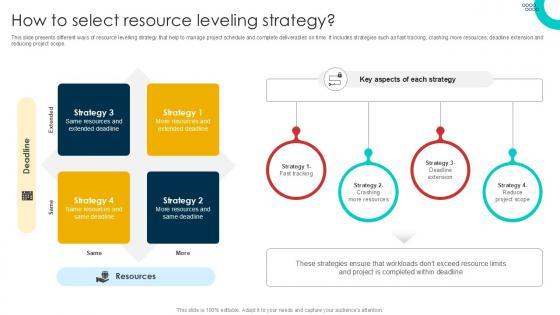 This slide presents different ways of resource levelling strategy that help to manage project schedule and complete deliverables on time. It includes strategies such as fast tracking, crashing more resources, deadline extension and reducing project scope. Crafting an eye-catching presentation has never been more straightforward. Let your presentation shine with this tasteful yet straightforward How To Select Resource Leveling Schedule Management Techniques PPT Slide template. It offers a minimalistic and classy look that is great for making a statement. The colors have been employed intelligently to add a bit of playfulness while still remaining professional. Construct the ideal How To Select Resource Leveling Schedule Management Techniques PPT Slide that effortlessly grabs the attention of your audience Begin now and be certain to wow your customers This slide presents different ways of resource levelling strategy that help to manage project schedule and complete deliverables on time. It includes strategies such as fast tracking, crashing more resources, deadline extension and reducing project scope.