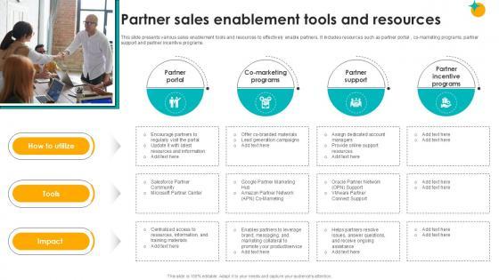 This slide presents various sales enablement tools and resources to effectively enable partners. It includes resources such as partner portal , co-marketing programs, partner support and partner incentive programs. Want to ace your presentation in front of a live audience Our Partner Sales Enablement Tools And Resources Partner Relationship Ppt Slides can help you do that by engaging all the users towards you. Slidegeeks experts have put their efforts and expertise into creating these impeccable powerpoint presentations so that you can communicate your ideas clearly. Moreover, all the templates are customizable, and easy-to-edit and downloadable. Use these for both personal and commercial use. This slide presents various sales enablement tools and resources to effectively enable partners. It includes resources such as partner portal , co marketing programs, partner support and partner incentive programs.