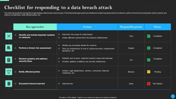 This slide represents the checklist for implementing a data breach response plan. The fundamental approaches are identify and isolate impacted systems or networks, perform a formal risk assessment, restore systems and address security flaws, notify affected parties, etc.From laying roadmaps to briefing everything in detail, our templates are perfect for you. You can set the stage with your presentation slides. All you have to do is download these easy-to-edit and customizable templates. Checklist For Responding To A Data Breach Attack Data Fortification Strengthening Defenses will help you deliver an outstanding performance that everyone would remember and praise you for. Do download this presentation today. This slide represents the checklist for implementing a data breach response plan. The fundamental approaches are identify and isolate impacted systems or networks, perform a formal risk assessment, restore systems and address security flaws, notify affected parties, etc.