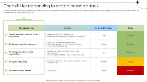 This slide represents the checklist for implementing a data breach response plan. The fundamental approaches are identify and isolate impacted systems or networks, perform a formal risk assessment, restore systems and address security flaws, notify affected parties, etc. From laying roadmaps to briefing everything in detail, our templates are perfect for you. You can set the stage with your presentation slides. All you have to do is download these easy-to-edit and customizable templates. Checklist For Responding To A Data Breach Attack Data Breach Prevention Microsoft Pdf will help you deliver an outstanding performance that everyone would remember and praise you for. Do download this presentation today. This slide represents the checklist for implementing a data breach response plan. The fundamental approaches are identify and isolate impacted systems or networks, perform a formal risk assessment, restore systems and address security flaws, notify affected parties, etc.