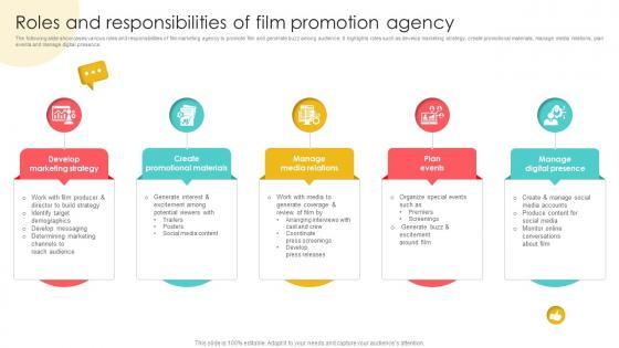 The following slide showcases various roles and responsibilities of film marketing agency to promote film and generate buzz among audience. It highlights roles such as develop marketing strategy, create promotional materials, manage media relations, plan events and manage digital presence. There are so many reasons you need a Marketing Channels For Movie Roles And Responsibilities Of Film Promotion Agency Strategy SS V. The first reason is you can not spend time making everything from scratch, Thus, Slidegeeks has made presentation templates for you too. You can easily download these templates from our website easily. The following slide showcases various roles and responsibilities of film marketing agency to promote film and generate buzz among audience. It highlights roles such as develop marketing strategy, create promotional materials, manage media relations, plan events and manage digital presence.