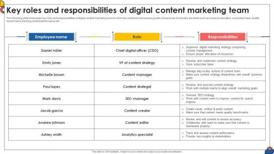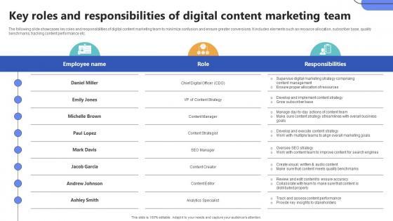 The following slide showcases key roles and responsibilities of digital content marketing team to minimize confusion and ensure greater conversions. It includes elements such as resource allocation, subscriber base, quality benchmarks, tracking content performance etc.Welcome to our selection of the Key Roles And Responsibilities Of Digital Content Comprehensive Guide To Implement Strategy SS V. These are designed to help you showcase your creativity and bring your sphere to life. Planning and Innovation are essential for any business that is just starting out. This collection contains the designs that you need for your everyday presentations. All of our PowerPoints are 100 percent editable, so you can customize them to suit your needs. This multi-purpose template can be used in various situations. Grab these presentation templates today. The following slide showcases key roles and responsibilities of digital content marketing team to minimize confusion and ensure greater conversions. It includes elements such as resource allocation, subscriber base, quality benchmarks, tracking content performance etc.