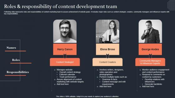 Following slide represents roles and responsibilities of content marketing team to assure achievement of website goals. It includes major roles such as content strategist, creators, community managers and influencer experts with key responsibilities. Do you have to make sure that everyone on your team knows about any specific topic I yes, then you should give Complete Guide To Launch Roles And Responsibility Of Content Development a try. Our experts have put a lot of knowledge and effort into creating this impeccable Complete Guide To Launch Roles And Responsibility Of Content Development. You can use this template for your upcoming presentations, as the slides are perfect to represent even the tiniest detail. You can download these templates from the Slidegeeks website and these are easy to edit. So grab these today Following slide represents roles and responsibilities of content marketing team to assure achievement of website goals. It includes major roles such as content strategist, creators, community managers and influencer experts with key responsibilities.