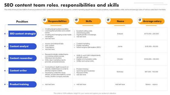 This slide shows job description of various positions in SEO content team which can be used by content marketing department. It includes positions, responsibilities, skills, name and average salary of various sales team members. Do you have an important presentation coming up Are you looking for something that will make your presentation stand out from the rest Look no further than SEO Strategy To Improve SEO Content Team Roles Responsibilities Strategy SS V. With our professional designs, you can trust that your presentation will pop and make delivering it a smooth process. And with Slidegeeks, you can trust that your presentation will be unique and memorable. So why wait Grab SEO Strategy To Improve SEO Content Team Roles Responsibilities Strategy SS V today and make your presentation stand out from the rest This slide shows job description of various positions in SEO content team which can be used by content marketing department. It includes positions, responsibilities, skills, name and average salary of various sales team members.