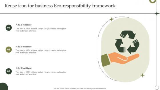 Pitch your topic with ease and precision using this Reuse Icon For Business Eco Responsibility Framework Information Pdf. This layout presents information on Reuse Icon For Business, Eco Responsibility Framework. It is also available for immediate download and adjustment. So, changes can be made in the color, design, graphics or any other component to create a unique layout. Our Reuse Icon For Business Eco Responsibility Framework Information Pdf are topically designed to provide an attractive backdrop to any subject. Use them to look like a presentation pro.