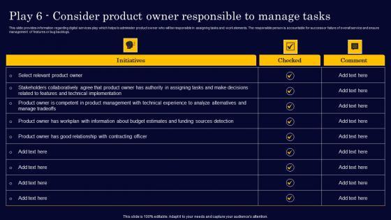 This slide provides information regarding digital services play which helps to administer product owner who will be responsible in assigning tasks and work elements. The responsible person is accountable for success or failure of overall service and ensure management of features or bug backlogs. Here you can discover an assortment of the finest PowerPoint and Google Slides templates. With these templates, you can create presentations for a variety of purposes while simultaneously providing your audience with an eye-catching visual experience. Download Playbook For Advancing Technology Play 6 Consider Product Owner Responsible Slides PDF to deliver an impeccable presentation. These templates will make your job of preparing presentations much quicker, yet still, maintain a high level of quality. Slidegeeks has experienced researchers who prepare these templates and write high-quality content for you. Later on, you can personalize the content by editing the Playbook For Advancing Technology Play 6 Consider Product Owner Responsible Slides PDF.