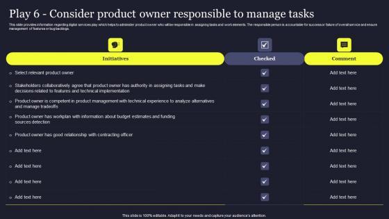 This slide provides information regarding digital services play which helps to administer product owner who will be responsible in assigning tasks and work elements. The responsible person is accountable for success or failure of overall service and ensure management of features or bug backlogs. Crafting an eye catching presentation has never been more straightforward. Let your presentation shine with this tasteful yet straightforward Play 6 Consider Product Owner Responsible Manage Technological Innovation Playbook Microsoft Pdf template. It offers a minimalistic and classy look that is great for making a statement. The colors have been employed intelligently to add a bit of playfulness while still remaining professional. Construct the ideal Play 6 Consider Product Owner Responsible Manage Technological Innovation Playbook Microsoft Pdf that effortlessly grabs the attention of your audience Begin now and be certain to wow your customers This slide provides information regarding digital services play which helps to administer product owner who will be responsible in assigning tasks and work elements. The responsible person is accountable for success or failure of overall service and ensure management of features or bug backlogs.