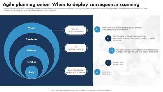 This slide provides information regarding agile planning onion which helps in deployment of consequence scanning during initial conception, at roadmap planning and each time when new feature is introduced. New consequences are developed when event is returned during roadmap planning. Boost your pitch with our creative Agile Planning Onion When To Deploy Responsible Tech Guide To Manage Background Pdf. Deliver an awe-inspiring pitch that will mesmerize everyone. Using these presentation templates you will surely catch everyones attention. You can browse the ppts collection on our website. We have researchers who are experts at creating the right content for the templates. So you do not have to invest time in any additional work. Just grab the template now and use them. This slide provides information regarding agile planning onion which helps in deployment of consequence scanning during initial conception, at roadmap planning and each time when new feature is introduced. New consequences are developed when event is returned during roadmap planning.
