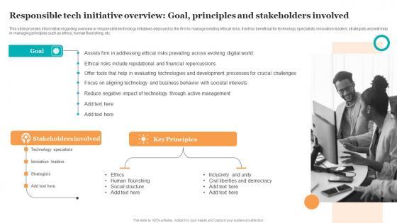 This slide provides information regarding overview or responsible technology initiatives deployed by the firm to manage existing ethical risks. It will be beneficial for technology specialists, innovation leaders, strategists and will help in managing principles such as ethics, human flourishing, etc. Boost your pitch with our creative Responsible Tech Initiative Overview Goal Principles Guide For Ethical Technology Demonstration Pdf. Deliver an awe-inspiring pitch that will mesmerize everyone. Using these presentation templates you will surely catch everyones attention. You can browse the ppts collection on our website. We have researchers who are experts at creating the right content for the templates. So you do not have to invest time in any additional work. Just grab the template now and use them. This slide provides information regarding overview or responsible technology initiatives deployed by the firm to manage existing ethical risks. It will be beneficial for technology specialists, innovation leaders, strategists and will help in managing principles such as ethics, human flourishing, etc.