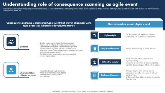 This slide provides information regarding consequence scanning as agile event that helps in mitigating serious issues. The characteristics of Agile event are lightweight, easy to understand, difficult to master, and offer inclusivity of different points of view, etc. From laying roadmaps to briefing everything in detail, our templates are perfect for you. You can set the stage with your presentation slides. All you have to do is download these easy-to-edit and customizable templates. Understanding Role Of Consequence Responsible Tech Guide To Manage Demonstration Pdf will help you deliver an outstanding performance that everyone would remember and praise you for. Do download this presentation today. This slide provides information regarding consequence scanning as agile event that helps in mitigating serious issues. The characteristics of Agile event are lightweight, easy to understand, difficult to master, and offer inclusivity of different points of view, etc.