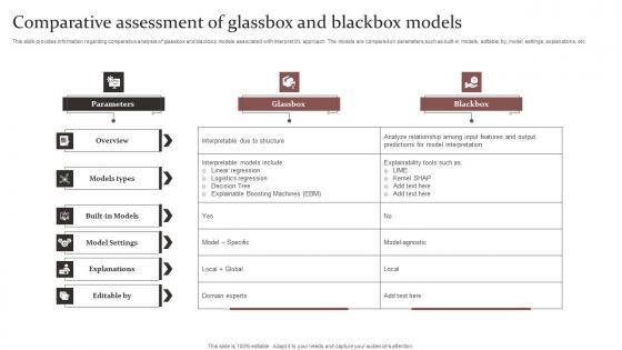 This slide provides information regarding comparative analysis of glassbox and blackbox models associated with Interpret ML approach. The models are compared on parameters such as built in models, editable by, model settings, explanations, etc. Want to ace your presentation in front of a live audience Our Comparative Assessment Of Responsible Technology Governance Manual Graphics Pdf can help you do that by engaging all the users towards you. Slidegeeks experts have put their efforts and expertise into creating these impeccable powerpoint presentations so that you can communicate your ideas clearly. Moreover, all the templates are customizable, and easy to edit and downloadable. Use these for both personal and commercial use. This slide provides information regarding comparative analysis of glassbox and blackbox models associated with Interpret ML approach. The models are compared on parameters such as built in models, editable by, model settings, explanations, etc.