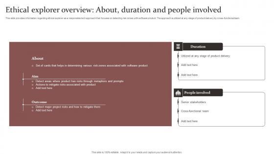 This slide provides information regarding ethical explorer as a responsible tech approach that focuses on detecting risk zones with software product. The approach is utilized at any stage of product delivery by cross functional team. Whether you have daily or monthly meetings, a brilliant presentation is necessary. Ethical Explorer Overview About Responsible Technology Governance Manual Pictures Pdf can be your best option for delivering a presentation. Represent everything in detail using Ethical Explorer Overview About Responsible Technology Governance Manual Pictures Pdf and make yourself stand out in meetings. The template is versatile and follows a structure that will cater to your requirements. All the templates prepared by Slidegeeks are easy to download and edit. Our research experts have taken care of the corporate themes as well. So, give it a try and see the results. This slide provides information regarding ethical explorer as a responsible tech approach that focuses on detecting risk zones with software product. The approach is utilized at any stage of product delivery by cross functional team.