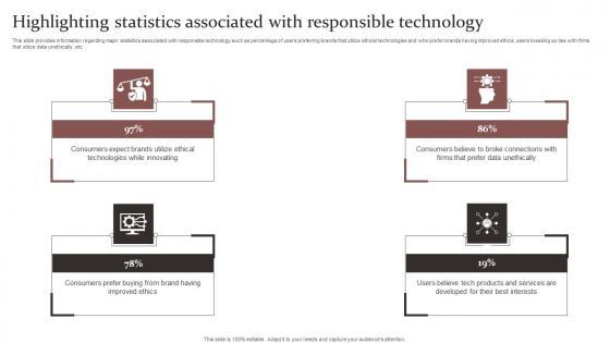 This slide provides information regarding major statistics associated with responsible technology such as percentage of users preferring brands that utilize ethical technologies and who prefer brands having improved ethics, users breaking up ties with firms that utilize data unethically, etc. Coming up with a presentation necessitates that the majority of the effort goes into the content and the message you intend to convey. The visuals of a PowerPoint presentation can only be effective if it supplements and supports the story that is being told. Keeping this in mind our experts created Highlighting Statistics Responsible Technology Governance Manual Demonstration Pdf to reduce the time that goes into designing the presentation. This way, you can concentrate on the message while our designers take care of providing you with the right template for the situation. This slide provides information regarding major statistics associated with responsible technology such as percentage of users preferring brands that utilize ethical technologies and who prefer brands having improved ethics, users breaking up ties with firms that utilize data unethically, etc.