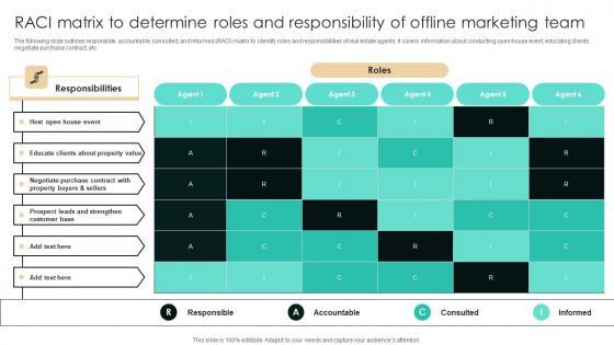 The following slide outlines responsible, accountable, consulted, and informed RACI matrix to identify roles and responsibilities of real estate agents. It covers information about conducting open house event, educating clients, negotiate purchase contract, etc. Do you have an important presentation coming up Are you looking for something that will make your presentation stand out from the rest Look no further than RACI Matrix To Determine Roles And Responsibility Of Offline Marketing Strategic Real Estate Sample Pdf With our professional designs, you can trust that your presentation will pop and make delivering it a smooth process. And with Slidegeeks, you can trust that your presentation will be unique and memorable. So why wait Grab RACI Matrix To Determine Roles And Responsibility Of Offline Marketing Strategic Real Estate Sample Pdf today and make your presentation stand out from the rest. The following slide outlines responsible, accountable, consulted, and informed RACI matrix to identify roles and responsibilities of real estate agents. It covers information about conducting open house event, educating clients, negotiate purchase contract, etc.