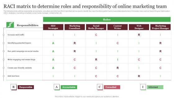 The following slide outlines responsible, accountable, consulted, and informed RACI matrix to identify roles and responsibilities of real estate agents. It covers information about conducting open house event, educating clients, negotiate purchase contract, etc. Get a simple yet stunning designed Online Marketing, Marketing Strategies It is the best one to establish the tone in your meetings. It is an excellent way to make your presentations highly effective. So, download this PPT today from Slidegeeks and see the positive impacts. Our easy-to-edit Online Marketing, Marketing Strategies can be your go-to option for all upcoming conferences and meetings. So, what are you waiting for Grab this template today. The following slide outlines responsible, accountable, consulted, and informed RACI matrix to identify roles and responsibilities of real estate agents. It covers information about conducting open house event, educating clients, negotiate purchase contract, etc.