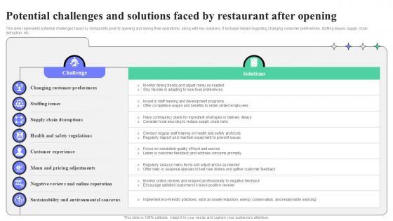 This slide represents potential challenges faced by restaurants post its opening and during their operations, along with key solutions. It includes details regarding changing customer preferences, staffing issues, supply chain disruption, etc. The best PPT templates are a great way to save time, energy, and resources. Slidegeeks have 100 percent editable powerpoint slides making them incredibly versatile. With these quality presentation templates, you can create a captivating and memorable presentation by combining visually appealing slides and effectively communicating your message. Download Potential Challenges And Solutions Faced By Restaurant After Strategic Guide To Launching Ppt Sample from Slidegeeks and deliver a wonderful presentation. This slide represents potential challenges faced by restaurants post its opening and during their operations, along with key solutions. It includes details regarding changing customer preferences, staffing issues, supply chain disruption, etc.