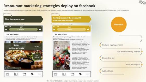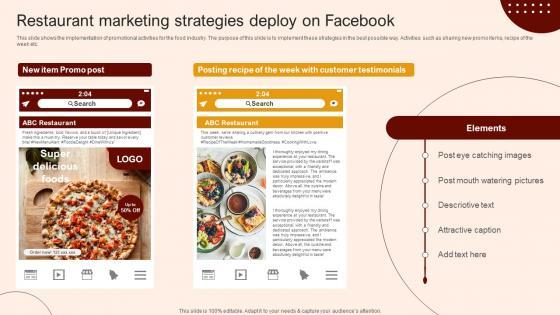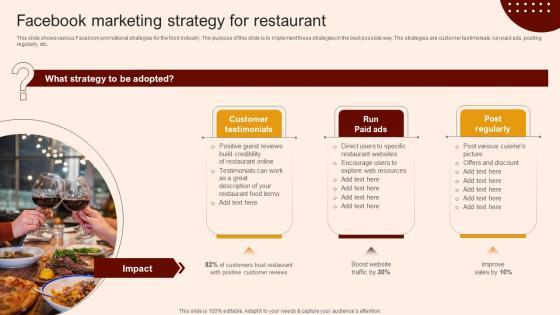 This slide shows various Facebook promotional strategies for the food industry. The purpose of this slide is to implement these strategies in the best possible way. The strategies are customer testimonials, run paid ads, posting regularly, etc. Slidegeeks is here to make your presentations a breeze with Create A Restaurant Marketing Facebook Marketing Strategy For Restaurant With our easy-to-use and customizable templates, you can focus on delivering your ideas rather than worrying about formatting. With a variety of designs to choose from, you are sure to find one that suits your needs. And with animations and unique photos, illustrations, and fonts, you can make your presentation pop. So whether you are giving a sales pitch or presenting to the board, make sure to check out Slidegeeks first This slide shows various Facebook promotional strategies for the food industry. The purpose of this slide is to implement these strategies in the best possible way. The strategies are customer testimonials, run paid ads, posting regularly, etc.