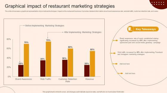 The slide showcases a graphical representation of promotional techniques impact on the restaurant business. It provides detailed information about brand awareness rate, website traffic, customer retention rate, and sales. Find highly impressive Graphical Impact Of Restaurant Marketing Strategies Create An Effective Restaurant on Slidegeeks to deliver a meaningful presentation. You can save an ample amount of time using these presentation templates. No need to worry to prepare everything from scratch because Slidegeeks experts have already done a huge research and work for you. You need to download Graphical Impact Of Restaurant Marketing Strategies Create An Effective Restaurant for your upcoming presentation. All the presentation templates are 100 percent editable and you can change the color and personalize the content accordingly. Download now. The slide showcases a graphical representation of promotional techniques impact on the restaurant business. It provides detailed information about brand awareness rate, website traffic, customer retention rate, and sales.