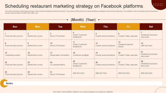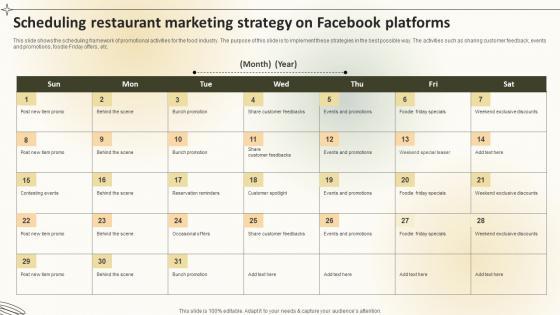 This slide shows the scheduling framework of promotional activities for the food industry. The purpose of this slide is to implement these strategies in the best possible way. The activities such as sharing customer feedback, events and promotions, foodie Friday offers, etc. Do you have an important presentation coming up Are you looking for something that will make your presentation stand out from the rest Look no further than Scheduling Restaurant Marketing Strategy On Facebook Platforms Create An Effective Restaurant. With our professional designs, you can trust that your presentation will pop and make delivering it a smooth process. And with Slidegeeks, you can trust that your presentation will be unique and memorable. So why wait Grab Scheduling Restaurant Marketing Strategy On Facebook Platforms Create An Effective Restaurant today and make your presentation stand out from the rest This slide shows the scheduling framework of promotional activities for the food industry. The purpose of this slide is to implement these strategies in the best possible way. The activities such as sharing customer feedback, events and promotions, foodie Friday offers, etc.