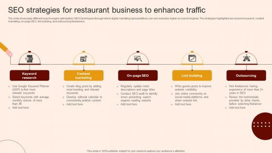 The slide showcases different search engine optimization SEO techniques through which digital marketing representatives can rank websites higher on search engines. The strategies highlighted are keyword research, content marketing, on-page SEO, link building, and outsourcing freelancers. Find highly impressive Create A Restaurant Marketing Seo Strategies For Restaurant Business To Enhance on Slidegeeks to deliver a meaningful presentation. You can save an ample amount of time using these presentation templates. No need to worry to prepare everything from scratch because Slidegeeks experts have already done a huge research and work for you. You need to download Create A Restaurant Marketing Seo Strategies For Restaurant Business To Enhance for your upcoming presentation. All the presentation templates are 100 percent editable and you can change the color and personalize the content accordingly. Download now The slide showcases different search engine optimization SEO techniques through which digital marketing representatives can rank websites higher on search engines. The strategies highlighted are keyword research, content marketing, on-page SEO, link building, and outsourcing freelancers.