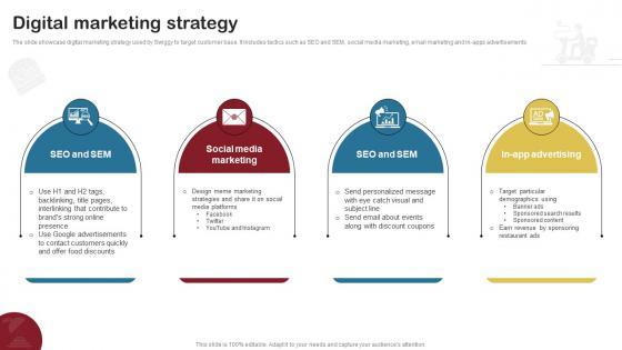 The slide showcase digital marketing strategy used by Swiggy to target customer base. It includes tactics such as SEO and SEM, social media marketing, email marketing and in-apps advertisements. Slidegeeks is here to make your presentations a breeze with Digital Marketing Strategy Food Delivery Company Profile CP SS V With our easy-to-use and customizable templates, you can focus on delivering your ideas rather than worrying about formatting. With a variety of designs to choose from, you are sure to find one that suits your needs. And with animations and unique photos, illustrations, and fonts, you can make your presentation pop. So whether you are giving a sales pitch or presenting to the board, make sure to check out Slidegeeks first The slide showcase digital marketing strategy used by Swiggy to target customer base. It includes tactics such as SEO and SEM, social media marketing, email marketing and in-apps advertisements.