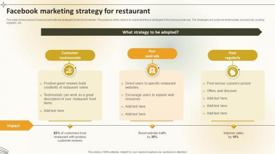 This slide shows various Facebook promotional strategies for the food industry. The purpose of this slide is to implement these strategies in the best possible way. The strategies are customer testimonials, run paid ads, posting regularly, etc. Do you have an important presentation coming up Are you looking for something that will make your presentation stand out from the rest Look no further than Facebook Marketing Strategy For Restaurant Create An Effective Restaurant. With our professional designs, you can trust that your presentation will pop and make delivering it a smooth process. And with Slidegeeks, you can trust that your presentation will be unique and memorable. So why wait Grab Facebook Marketing Strategy For Restaurant Create An Effective Restaurant today and make your presentation stand out from the rest This slide shows various Facebook promotional strategies for the food industry. The purpose of this slide is to implement these strategies in the best possible way. The strategies are customer testimonials, run paid ads, posting regularly, etc.