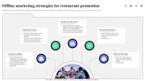 This slide represents offline marketing strategies for promotion of family-style restaurants. It highlights local partnership, community events, family-focused events, etc. Formulating a presentation can take up a lot of effort and time, so the content and message should always be the primary focus. The visuals of the PowerPoint can enhance the presenters message, so our Offline Marketing Strategies For Restaurant Promotion Strategic Guide To Launching Ppt Powerpoint was created to help save time. Instead of worrying about the design, the presenter can concentrate on the message while our designers work on creating the ideal templates for whatever situation is needed. Slidegeeks has experts for everything from amazing designs to valuable content, we have put everything into Offline Marketing Strategies For Restaurant Promotion Strategic Guide To Launching Ppt Powerpoint. This slide represents offline marketing strategies for promotion of family-style restaurants. It highlights local partnership, community events, family-focused events, etc.