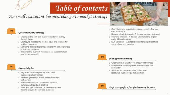 You can survive and sail through cut throat competition if you have the right skills and products at hand. If a business plan is on your upcoming agenda, then it will not be wise of you to proceed in absence of our well designed Small Restaurant Business Plan Go To Market Strategy document. Our business plan word document swears by in depth detailing and thus answers every question that may hit you or your audience at any point of time. Whats more, are the multi fold benefits that our word document offers. Made up of high resolution graphics, this document does not hamper when projected on a wide screen. Being pre designed and thoroughly editable this ready made business plan saves a lot of the presenters time and efforts which otherwise get wasted in designing the business plan from scratch. We make our business plan word documents available to you keeping in mind the competitive edge. Join your hands with us now. Our Small Restaurant Business Plan Go To Market Strategy are topically designed to provide an attractive backdrop to any subject. Use them to look like a presentation pro.