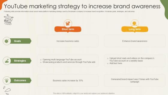 Following slide provides information about social media platform marketing strategy used by Mcdonalds company to increase brand recognition. It includes goals, strategies, and outcomes. Do you have an important presentation coming up Are you looking for something that will make your presentation stand out from the rest Look no further than Youtube Marketing Strategy To Increase Food And Beverages Company Profile Ppt Slide CP SS V With our professional designs, you can trust that your presentation will pop and make delivering it a smooth process. And with Slidegeeks, you can trust that your presentation will be unique and memorable. So why wait Grab Youtube Marketing Strategy To Increase Food And Beverages Company Profile Ppt Slide CP SS V today and make your presentation stand out from the rest Following slide provides information about social media platform marketing strategy used by Mcdonalds company to increase brand recognition. It includes goals, strategies, and outcomes.