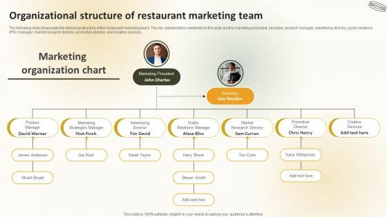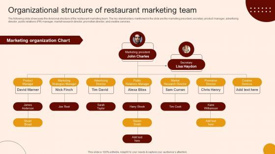 The following slide showcases the divisional structure of the restaurant marketing team. The key stakeholders mentioned in the slide are the marketing president, secretary, product manager, advertising director, public relations PR manager, market research director, promotion director, and creative services. This Organizational Structure Of Restaurant Marketing Team Create An Effective Restaurant is perfect for any presentation, be it in front of clients or colleagues. It is a versatile and stylish solution for organizing your meetings. The Organizational Structure Of Restaurant Marketing Team Create An Effective Restaurant features a modern design for your presentation meetings. The adjustable and customizable slides provide unlimited possibilities for acing up your presentation. Slidegeeks has done all the homework before launching the product for you. So, do not wait, grab the presentation templates today. The following slide showcases the divisional structure of the restaurant marketing team. The key stakeholders mentioned in the slide are the marketing president, secretary, product manager, advertising director, public relations PR manager, market research director, promotion director, and creative services.