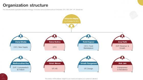The slide illustrate organization structure of Swiggy. It includes various position such as CO founder, CFO, CEO, SVP, VP, Director etc. The Organization Structure Food Delivery Company Profile CP SS V is a compilation of the most recent design trends as a series of slides. It is suitable for any subject or industry presentation, containing attractive visuals and photo spots for businesses to clearly express their messages. This template contains a variety of slides for the user to input data, such as structures to contrast two elements, bullet points, and slides for written information. Slidegeeks is prepared to create an impression. The slide illustrate organization structure of Swiggy. It includes various position such as CO founder, CFO, CEO, SVP, VP, Director etc.