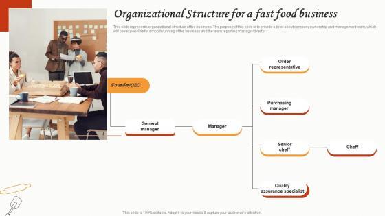 This slide represents organizational structure of the business. The purpose of this slide is to provide a brief about company ownership and management team, which will be responsible for smooth running of the business and the team reporting manager director. There are so many reasons you need a Organizational Structure For A Fast Food Business Small Restaurant Business Structure Pdf The first reason is you can not spend time making everything from scratch, Thus, Slidegeeks has made presentation templates for you too. You can easily download these templates from our website easily. This slide represents organizational structure of the business. The purpose of this slide is to provide a brief about company ownership and management team, which will be responsible for smooth running of the business and the team reporting manager director.