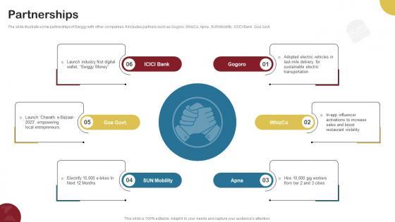 The slide illustrate some partnerships of Swiggy with other companies. It includes partners such as Gogoro, WhizCo, Apna, SUN Mobility, ICICI Bank, Goa Govt. Retrieve professionally designed Partnerships Food Delivery Company Profile CP SS V to effectively convey your message and captivate your listeners. Save time by selecting pre-made slideshows that are appropriate for various topics, from business to educational purposes. These themes come in many different styles, from creative to corporate, and all of them are easily adjustable and can be edited quickly. Access them as PowerPoint templates or as Google Slides themes. You do not have to go on a hunt for the perfect presentation because Slidegeeks got you covered from everywhere. The slide illustrate some partnerships of Swiggy with other companies. It includes partners such as Gogoro, WhizCo, Apna, SUN Mobility, ICICI Bank, Goa Govt.