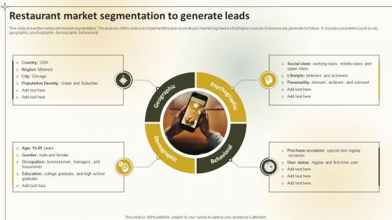 This slide shows the restaurant market segmentation. The purpose of this slide is to implement the plan according to market segment so that higher sources of revenue are generated in future. It includes parameters such as etc. geographic, psychographic, demographic, behavioral. Do you have to make sure that everyone on your team knows about any specific topic I yes, then you should give Create A Restaurant Marketing Restaurant Market Segmentation To Generate Leads a try. Our experts have put a lot of knowledge and effort into creating this impeccable Create A Restaurant Marketing Restaurant Market Segmentation To Generate Leads. You can use this template for your upcoming presentations, as the slides are perfect to represent even the tiniest detail. You can download these templates from the Slidegeeks website and these are easy to edit. So grab these today This slide shows the restaurant market segmentation. The purpose of this slide is to implement the plan according to market segment so that higher sources of revenue are generated in future. It includes parameters such as etc. geographic, psychographic, demographic, behavioral.