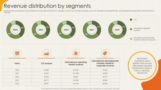 Mentioned slide demonstrates revenue distribution revenue split of McDonalds corporation over the year. It includes segments such as US, International operated markets, and International developmental licensed markets and corporate. Slidegeeks is one of the best resources for PowerPoint templates. You can download easily and regulate Revenue Distribution By Segments Food And Beverages Company Profile Ppt Template CP SS V for your personal presentations from our wonderful collection. A few clicks is all it takes to discover and get the most relevant and appropriate templates. Use our Templates to add a unique zing and appeal to your presentation and meetings. All the slides are easy to edit and you can use them even for advertisement purposes. Mentioned slide demonstrates revenue distribution revenue split of McDonalds corporation over the year. It includes segments such as US, International operated markets, and International developmental licensed markets and corporate.