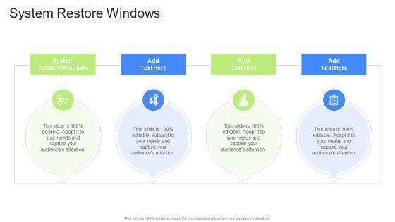 Presenting our innovatively designed set of slides titled System Restore Windows In Powerpoint And Google Slides Cpb. This completely editable PowerPoint graphic exhibits System Restore Windows that will help you convey the message impactfully. It can be accessed with Google Slides and is available in both standard screen and widescreen aspect ratios. Apart from this, you can download this well structured PowerPoint template design in different formats like PDF, JPG, and PNG. So, click the download button now to gain full access to this PPT design. Our System Restore Windows In Powerpoint And Google Slides Cpb are topically designed to provide an attractive backdrop to any subject. Use them to look like a presentation pro.