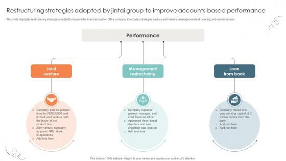 This slide highlights restructuring strategies adopted to improve the financial position of the company. It includes strategies such as joint venture, management restructuring, and loan from bank. Are you searching for a Restructuring Strategies Adopted By Jintai Group To Improve Accounts Based Performance that is uncluttered, straightforward, and original Its easy to edit, and you can change the colors to suit your personal or business branding. For a presentation that expresses how much effort you have put in, this template is ideal With all of its features, including tables, diagrams, statistics, and lists, its perfect for a business plan presentation. Make your ideas more appealing with these professional slides. Download Restructuring Strategies Adopted By Jintai Group To Improve Accounts Based Performance from Slidegeeks today. This slide highlights restructuring strategies adopted to improve the financial position of the company. It includes strategies such as joint venture, management restructuring, and loan from bank.