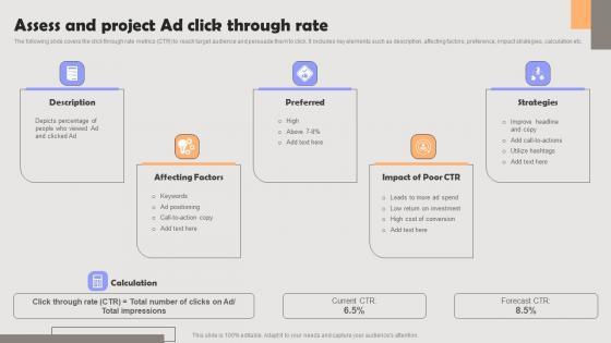 The following slide covers the click through rate metrics CTR to reach target audience and persuade them to click. It includes key elements such as description, affecting factors, preference, impact strategies, calculation etc. Want to ace your presentation in front of a live audience Our Improving PPC Campaign Results Assess And Project Ad Click Through Rate Rules Pdf can help you do that by engaging all the users towards you. Slidegeeks experts have put their efforts and expertise into creating these impeccable powerpoint presentations so that you can communicate your ideas clearly. Moreover, all the templates are customizable, and easy-to-edit and downloadable. Use these for both personal and commercial use. The following slide covers the click through rate metrics CTR to reach target audience and persuade them to click. It includes key elements such as description, affecting factors, preference, impact strategies, calculation etc.
