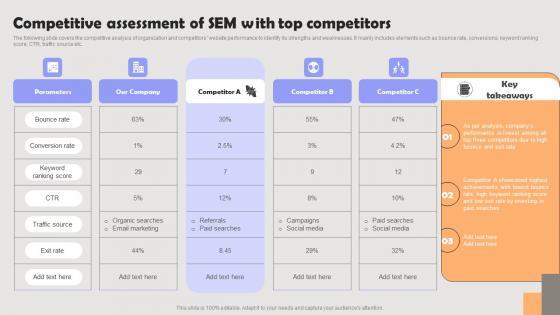 The following slide covers the competitive analysis of organization and competitors website performance to identify its strengths and weaknesses. It mainly includes elements such as bounce rate, conversions, keyword ranking score, CTR, traffic source etc. Present like a pro with Improving PPC Campaign Results Competitive Assessment Of Sem With Top Information Pdf Create beautiful presentations together with your team, using our easy-to-use presentation slides. Share your ideas in real-time and make changes on the fly by downloading our templates. So whether you are in the office, on the go, or in a remote location, you can stay in sync with your team and present your ideas with confidence. With Slidegeeks presentation got a whole lot easier. Grab these presentations today. The following slide covers the competitive analysis of organization and competitors website performance to identify its strengths and weaknesses. It mainly includes elements such as bounce rate, conversions, keyword ranking score, CTR, traffic source etc.
