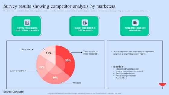 This slide showcases statistical data presenting survey results on how often marketers assess market competition. Its purpose is to control business positioning strategy and acquire maximum customer base This modern and well arranged Survey Results Showing Competitor How To Conduct Competitive Assessment Portrait Pdf provides lots of creative possibilities. It is very simple to customize and edit with the Powerpoint Software. Just drag and drop your pictures into the shapes. All facets of this template can be edited with Powerpoint no extra software is necessary. Add your own material, put your images in the places assigned for them, adjust the colors, and then you can show your slides to the world, with an animated slide included. This slide showcases statistical data presenting survey results on how often marketers assess market competition. Its purpose is to control business positioning strategy and acquire maximum customer base