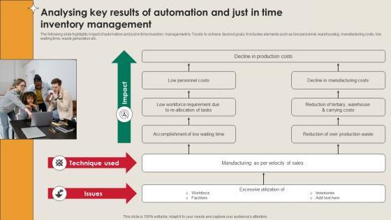 The following slide highlights impact of automation and just in time inventory management by Toyota to achieve desired goals. It includes elements such as low personnel, warehousing, manufacturing costs, low waiting time, waste generation etc. Boost your pitch with our creative Analysing Key Results Of Automation And Just Implementing Manufacturing Strategy SS V. Deliver an awe-inspiring pitch that will mesmerize everyone. Using these presentation templates you will surely catch everyones attention. You can browse the ppts collection on our website. We have researchers who are experts at creating the right content for the templates. So you do not have to invest time in any additional work. Just grab the template now and use them. The following slide highlights impact of automation and just in time inventory management by Toyota to achieve desired goals. It includes elements such as low personnel, warehousing, manufacturing costs, low waiting time, waste generation etc.