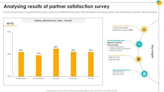 This slide analyzes the survey of respondents who were asked to rate their level of satisfaction with the company. Partnership satisfaction were assessed based on values of collaboration, accountability, respect, and excellence.Create an editable Analysing Results Of Partner Satisfaction Survey Partner Relationship Ppt Slides that communicates your idea and engages your audience. Whether you are presenting a business or an educational presentation, pre-designed presentation templates help save time. Analysing Results Of Partner Satisfaction Survey Partner Relationship Ppt Slides is highly customizable and very easy to edit, covering many different styles from creative to business presentations. Slidegeeks has creative team members who have crafted amazing templates. So, go and get them without any delay. This slide analyzes the survey of respondents who were asked to rate their level of satisfaction with the company. Partnership satisfaction were assessed based on values of collaboration, accountability, respect, and excellence.