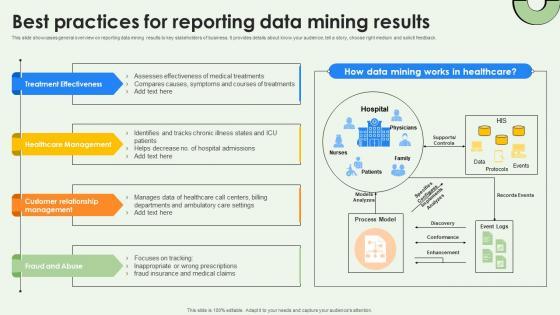 This slide showcases general overview on reporting data mining results to key stakeholders of business. It provides details about treatment effectiveness, healthcare management, customer relationship management, fraud and abuse. Here you can discover an assortment of the finest PowerPoint and Google Slides templates. With these templates, you can create presentations for a variety of purposes while simultaneously providing your audience with an eye-catching visual experience. Download Reporting Data Mining Results To Stakeholders Using Data Mining Tools To Optimize Processes AI SS V to deliver an impeccable presentation. These templates will make your job of preparing presentations much quicker, yet still, maintain a high level of quality. Slidegeeks has experienced researchers who prepare these templates and write high-quality content for you. Later on, you can personalize the content by editing the Reporting Data Mining Results To Stakeholders Using Data Mining Tools To Optimize Processes AI SS V. This slide showcases general overview on reporting data mining results to key stakeholders of business. It provides details about treatment effectiveness, healthcare management, customer relationship management, fraud and abuse.