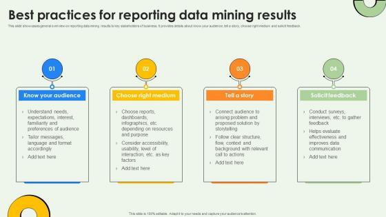This slide showcases general overview on reporting data mining results to key stakeholders of business. It provides details about know your audience, tell a story, choose right medium and solicit feedback. From laying roadmaps to briefing everything in detail, our templates are perfect for you. You can set the stage with your presentation slides. All you have to do is download these easy-to-edit and customizable templates. Best Practices For Reporting Data Mining Results Using Data Mining Tools To Optimize Processes AI SS V will help you deliver an outstanding performance that everyone would remember and praise you for. Do download this presentation today. This slide showcases general overview on reporting data mining results to key stakeholders of business. It provides details about know your audience, tell a story, choose right medium and solicit feedback.