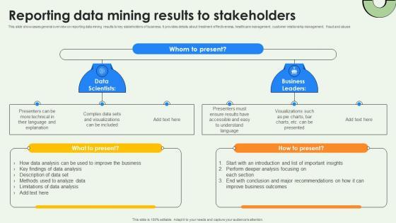 This slide showcases general overview on reporting data mining results to key stakeholders of business. It provides details about treatment effectiveness, healthcare management, customer relationship management, fraud and abuse. Are you in need of a template that can accommodate all of your creative concepts This one is crafted professionally and can be altered to fit any style. Use it with Google Slides or PowerPoint. Include striking photographs, symbols, depictions, and other visuals. Fill, move around, or remove text boxes as desired. Test out color palettes and font mixtures. Edit and save your work, or work with colleagues. Download Data Warehousing And Reporting Data Mining Results To Stakeholders AI SS V and observe how to make your presentation outstanding. Give an impeccable presentation to your group and make your presentation unforgettable. This slide showcases general overview on reporting data mining results to key stakeholders of business. It provides details about treatment effectiveness, healthcare management, customer relationship management, fraud and abuse.