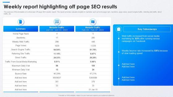 From laying roadmaps to briefing everything in detail, our templates are perfect for you. You can set the stage with your presentation slides. All you have to do is download these easy-to-edit and customizable templates. Weekly Report Highlighting Off Page Seo Results will help you deliver an outstanding performance that everyone would remember and praise you for. Do download this presentation today. Measure your Off-page SEO results with our Weekly report presentation template. Highlight website traffic, backlinks, and referral traffic in a professional and easy-to-understand format. This PPT bundle is perfect for presenting SEO results to clients or internal teams.