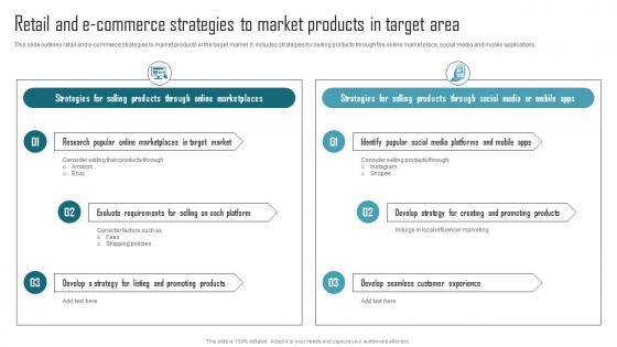 This slide outlines retail and e-commerce strategies to market products in the target market. It includes strategies for selling products through the online market place, social media and mobile applications. Get a simple yet stunning designed Effective Product Adaptation Purpose Of Conducting Market Analysis For Product Professional Pdf It is the best one to establish the tone in your meetings. It is an excellent way to make your presentations highly effective. So, download this PPT today from Slidegeeks and see the positive impacts. Our easy-to-edit Effective Product Adaptation Purpose Of Conducting Market Analysis For Product Professional Pdf can be your go-to option for all upcoming conferences and meetings. So, what are you waiting for Grab this template today. This slide outlines retail and e-commerce strategies to market products in the target market. It includes strategies for selling products through the online market place, social media and mobile applications.