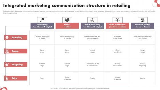 Deliver an awe-inspiring pitch with this creative integrated marketing communications in retailing themes pdf. bundle. Topics like great for brand building, targeting limited, sales promotion can be discussed with this completely editable template. It is available for immediate download depending on the needs and requirements of the user.