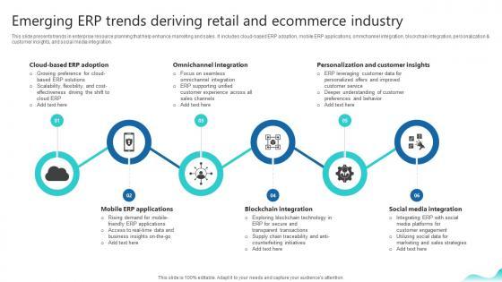 This slide presents trends in enterprise resource planning that help enhance marketing and sales . It includes cloud-based ERP adoption, mobile ERP applications, omnichannel integration, blockchain integration, personalization and customer insights, and social media integration. This Emerging Erp Trends Deriving Retail And Ecommerce Erp And Digital Transformation For Maximizing DT SS V is perfect for any presentation, be it in front of clients or colleagues. It is a versatile and stylish solution for organizing your meetings. The Emerging Erp Trends Deriving Retail And Ecommerce Erp And Digital Transformation For Maximizing DT SS V features a modern design for your presentation meetings. The adjustable and customizable slides provide unlimited possibilities for acing up your presentation. Slidegeeks has done all the homework before launching the product for you. So, do not wait, grab the presentation templates today This slide presents trends in enterprise resource planning that help enhance marketing and sales . It includes cloud-based ERP adoption, mobile ERP applications, omnichannel integration, blockchain integration, personalization and customer insights, and social media integration.